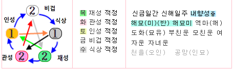 ▸ 일간 신금은 시지 유금에 통근이 되었으나, 월간과 시간 편관의 극을 받는 입장이라, 정신적인 갈등과 스트레스가 있다고 봅니다.