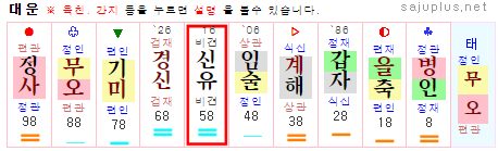 ▸신유대운-경신대운(58-77세) 금오행인 비겁운으로 용신운입니다. 추진하는 일도 어느 정도 안정되고, 재물을 축척할 수 있는 좋은 시기입니다.