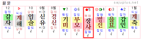 ❚ 월운 요약 해마다 양력 2월부터 6월, 11월 12월 보다는, 7월부터 10월까지가 더 좋은 달입니다. 특히, 양력 4월과 5월은 부부간의 갈등과 가정사에 유의해야 하고, 11월은 건강 문제에 신경을 써야 합니다. |