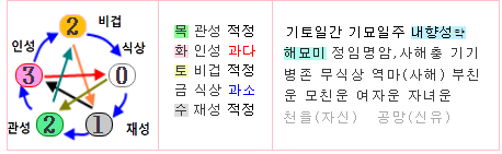 결국, 일간의 세력은 4, 반대세력은 6정도의 힘을 가진 것으로 보아, 신약한 명조로 봅니다. 신약한 명조의 용희신은 인성과 비겁으로, 용신은 비겁인 토오행, 희신은 인성인 화오행이 해당하고, 기신에는 토오행과 화오행을 극하는 목과 수오행이 해당합니다. 신약한 명조라 한신인 식상 금오행도 기신 반열에 둡니다.