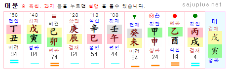 ▸임오대운 (44-53세) 오화는 용신인 화오행으로 인성운이라, 직장에서의 승진이나 보직의 이동이 있는 좋은 운입니다.