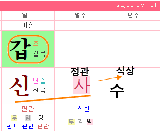 ▸직업문제 편관인 일지 신금이 식상인 사화를 향하고 있습니다. 이 부분을 지지인 신금 입장에서 보면, 관성인 사화를 향하고, 식상인 수오행을 만드는 경우가 됩니다. 따라서, 남편인 편관 신금은 관성에 가치를 두게 되어 제도나 규율을 중시하고, 강한 책임감으로 조직사회에 충실한 사람이 된다고 봅니다.