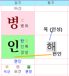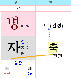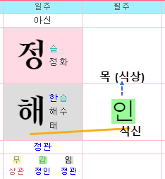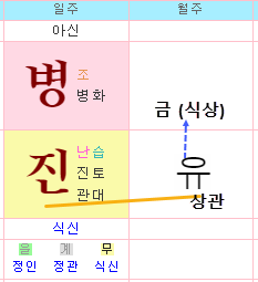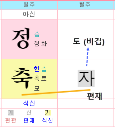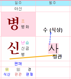 ❚ 지장간 정재 신금, 겁재 정화, 식신 무토 겁재가 식신을 생조하고 신신이 정재를 생조하는 식상생재의 기운입니다. ▸식상생재 : 돈이 되는 일이라면 어떤일이든 추진하려 듭니다. 남명의 경우 여자들에게 정성을 다하게 되니 따르는 여자도 많지만, 바람둥이 기질도 나타납니다. 지장간에 겁재가 위치해 조심성, 경계심도 많을 수 있고, 금전관리에 주의도 필요합니다.