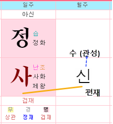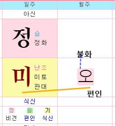 ❚ 지장간 비견 정화, 편인 을목, 식신 기토 ▸도식 : 자신을 드러내거나 표현하는 언변이나 능력이 편인으로 인해 제약을 받는 경우가 해당됩니다. 생각은 많지만, 추진하는 일이 뜻대로 풀리지 않으니 심리적으로 위축되거나 활동성 부족과 정신적인 갈등이 따르기 쉽습니다. 별러기 보다는 추진해 나가려는 의지가 필요합니다.