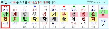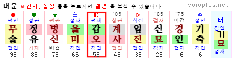 ▸갑오대운 화오행과 목오행이 용희신인 명조에서 첫대운인 기축대운을 제외하면 35세까지는 봄기운인 목운, 그 다음은 현재까지 여름기운인 화운입니다. 그 중에서도 갑오대운은 천간과 지지가 모두 용신운에 해당하는 최고의 운입니다.